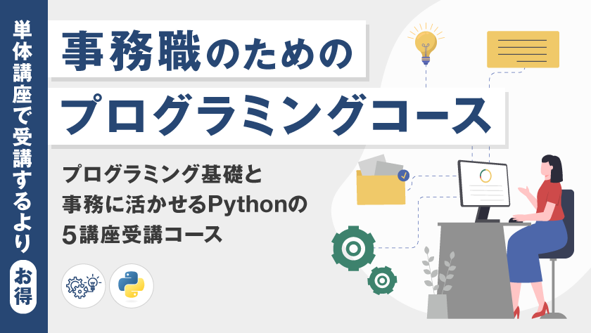 ここでご紹介した6講座がセットになった、おトクなおまとめコース。プログラミング未経験の事務職の方でも、イチから始めて、日々のオフィスワークがぐっとラクになる実用的なプログラミングスキルが身につきます。